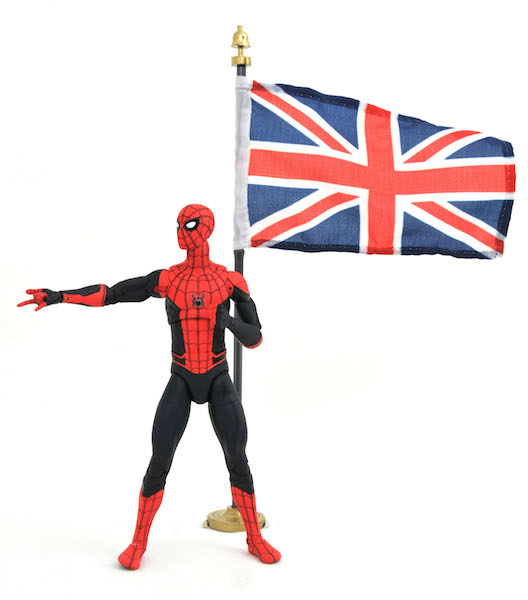 Measuring approximately 7 inches tall and featuring 16 points of articulation, for all your wall-crawling and web-swinging poses, this action figure includes four interchangeable pairs of hands and a British flag and flagpole. It comes packaged in the display-ready Select action figure packaging, with side-panel artwork for shelf reference.
