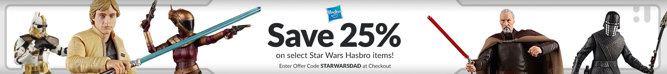 Entertainment Earth is offering 25% off on select Hasbro Star Wars figures and collectibles until June 21st. Free shipping is offered on in-stock orders of $79 or more, and use coupon code STARWARSDAD to get the savings.