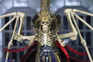 Here are the two additional parts of the wings attached, with the front part of it facing forward. The Scythe can be held in one or two open grip hands, and is a wooden brown, with metallic silver on the handle, a metallic silver blade, and gold skeletons that serve as a decoration on this weapon. Behind the Scythe has a skeletal body that is holding staff, with the same back head piece that’s small compared to Necronominus.
