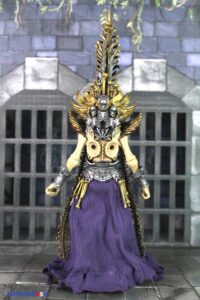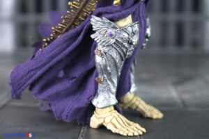 The head sculpt has this metallic gold crown on the forehead, with a purple gem, gold armor on the sides of the head, and this long skeletal gold design on the back of the head that measures almost 4 inches long, and underneath it are grey feathers. This is an unusual design for sure, but as always the Four Horsemen Studios always seem to make anything work. He also has a gold bone collar around his neck and metallic silver on the back of it, and behind it are metallic silver and grey skeleton’s.