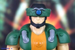 His head sculpt includes a spinning green visor, with three different eyes (orange, green and blue), with a grey eye lash above it, a black helmet and nicely done facial details.